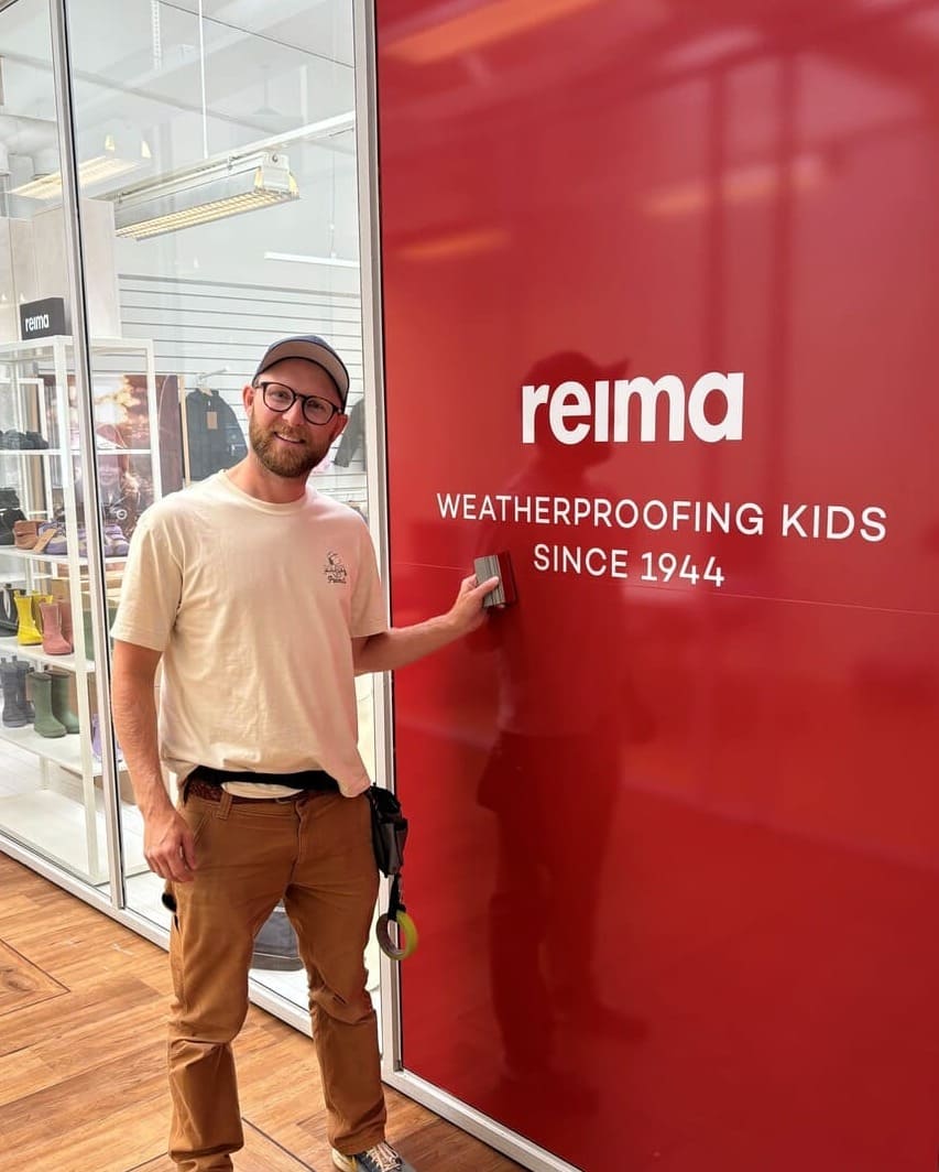Fönsterstripning gör vi titt som tätt. Här har vi både printat och monterat en folie på ett fönster för barnklädesmärket Reima. Folien är hela 288 cm hög och 137 cm bred.