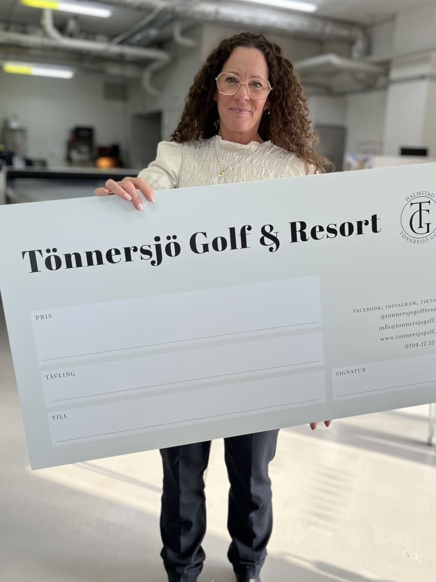 Den stora värdechecken på bilden är i formatet 120x60cm, upptryckt på hård kapaskiva. Visst är den fin! Den har vi både designat och tryckt åt Tönnersjö golf och resort.